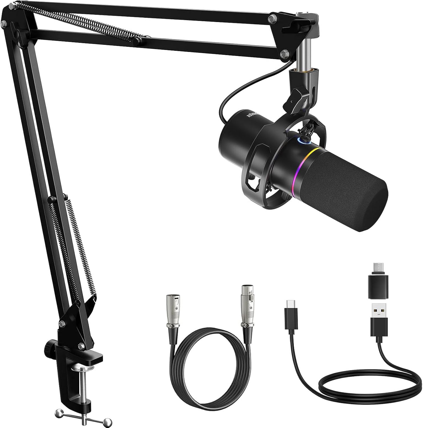 XLR/USB Dynamic Microphone Kit, PC Microphone for Streaming, Podcasting, Gaming, RGB, Mute and Noise Cancelling Function, Volume Control, Headphone Jack